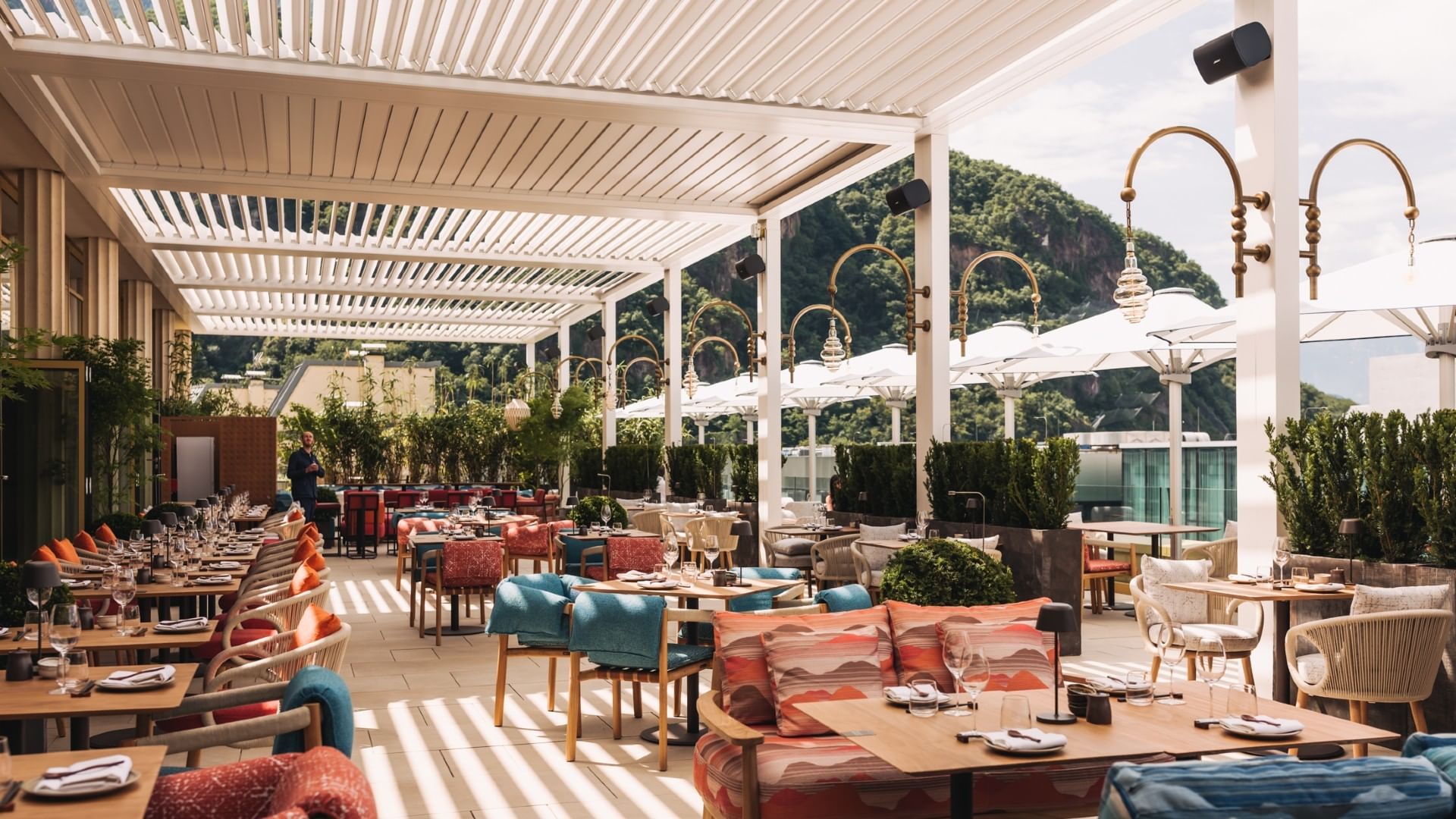 Above the city, beyond the expected: Rooftop Restaurant & Bar in Bolzano with stylish Private Rooms. Mochi cuisine for lunch & dinner, Falkensteiner hotel breakfast in the morning – all above the rooftops of Bolzano.