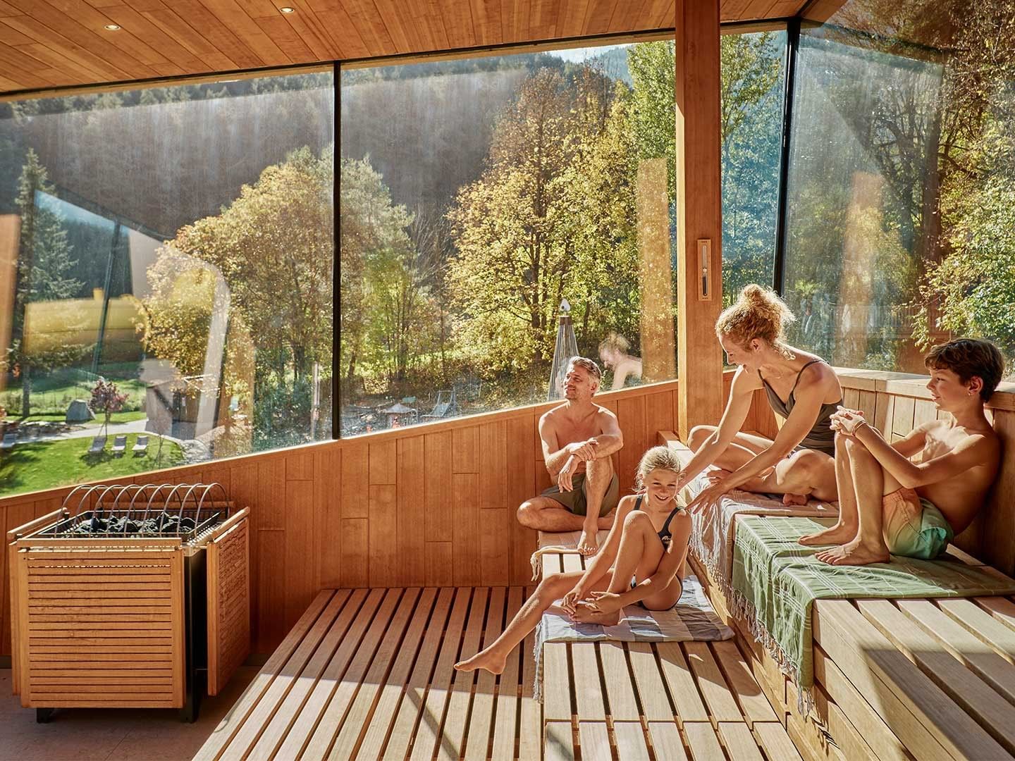 Zum Kuscheln und Entspannen können Sie sich nach der ganzen Action in unsere Family Relax Zone zurückziehen, bevor die Entdeckungsreise Sie weiter auf unser Hoteldach führt, wo sich eine wohltemperierte Family Sauna (Textilsauna) befindet.